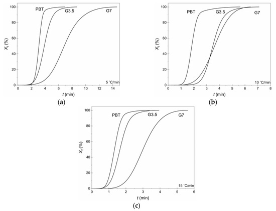 Xt vs. t for pure PBT, G3.5 and G7 vitrimers (3 h at 180 °C) at each cooling rate: (a) 5 °C/min, (b) 10 °C/min and (c) 15 °C/min.