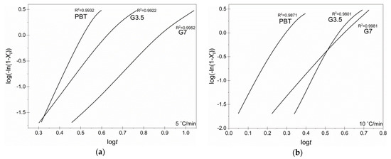 Figure 7 demonstrates the standard plots of versus for pure PBT and vitrimers G3.5 and G7, in which straight lines were obtained in every sample (R2 > 0.9960). From the slopes of these lines, the values of B and B* were calculated.
