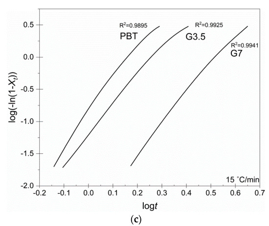 Avrami-type plots for pure PBT, G3.5 and G7 vitrimers (3 h at 180 °C with Xt ranging from 2 to 95%, at each cooling rate: (a) 5 °C/min, (b) 10 °C/min and (c) 15 °C/min.