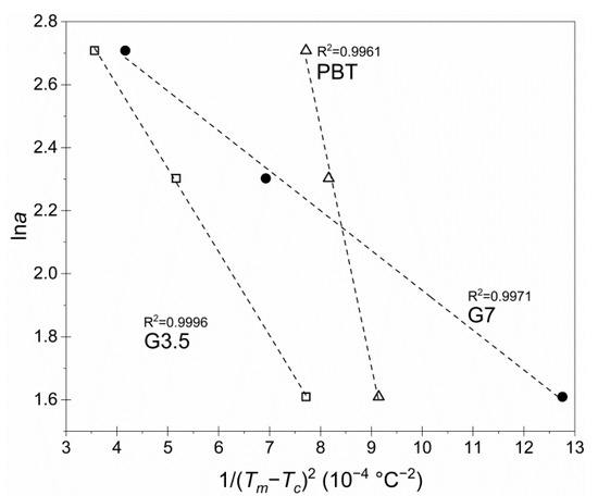where B corresponds to homogenous nucleation (pure PBT) and B* to heterogeneous nucleation (G3.5 and G7). In particular, B is a parameter that can be computed using the Equation (14):