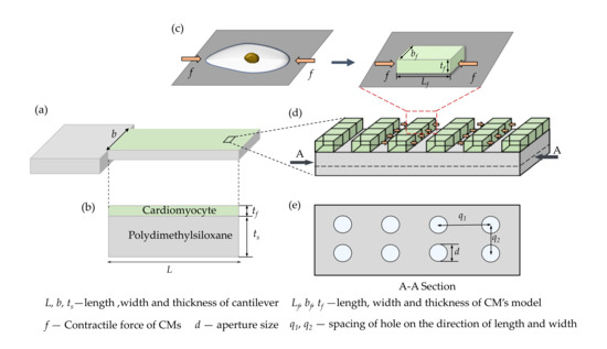 - Nguyen, T.K.; Lee, D.W.; Lee, B.K. Numerical investigation of perforated polymer microcantilever sensor for contractile behavior of cardiomyocytes. Jpn. J. Appl. Phys. 2017, 56, 06GM01. [Google Scholar] [CrossRef]