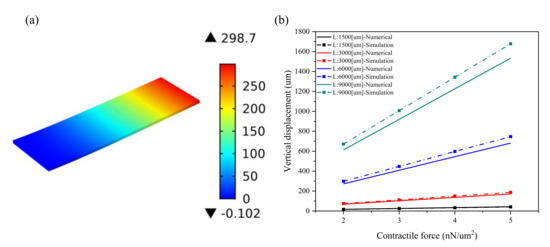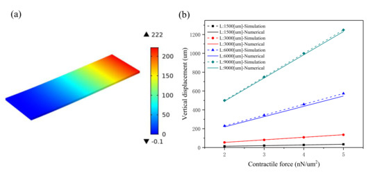 The numerical and simulation results of the maximum displacements at the free end of the plain microcantilever under different conditions (contractile force: 2~5 nN/μm2): (a) vertical displacement plot of the plain microcantilever (the microcantilever lengths are 1500, 3000, 6000, and 9000 μm, respectively) when the contractile force is 2 nN/μm2; (b) the effect of contractile force on the maximum displacements of the plain microcantilever with different sizes (the microcantilever lengths are 1500, 3000, 6000, and 9000 μm, respectively; the aspect ratio is 3:1; and thickness is 100 µm).