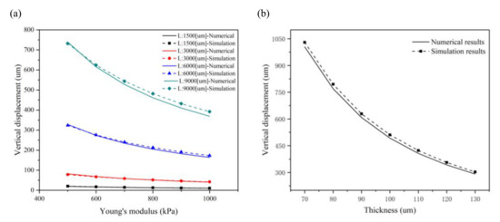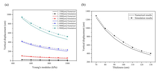 Young’s modulus on the bending displacement of the perforated cantilever was also examined, wherein Young’s modulus increased from 500 to 1000 kPa with intervals of 100 kPa, as shown in Figure 5a. Similarly, the numerical results agreed well with the simulation results, and both show a nonlinear, inverse relationship between Young’s modulus and bending displacement. However, when Young’s modulus exceeds 750 kPa, the bending displacement reduction rate decreases; the same tendency is also observed in a plain microcantilever. With an increase in Young’s modulus, the gap between the simulation and numerical results increases, as the larger the Young’s modulus of the substrate, the greater the error in Stoney’s calculation. Simultaneously, perforation can also further increase the bending displacement. Compared with the plain microcantilever, as shown in Figure 3a and Figure 5a, the maximum bending displacement in the simulation results shows an increase of 30%. In the numerical results, it offers an increase of 22% in all size cases. Therefore, the perforated microcantilever can obtain a lower bending displacement at a higher Young’s modulus. Furthermore, the effect of the perforated microcantilever thickness on the bending displacement was studied, as shown in Figure 5b, where the microcantilever length is 9000 μm and the CMs’ contractile force is 2 nN/um2. The numerical results agreed well with the simulation solution with an increase in the thickness of the substrate from 70 to 130 μm, with intervals of 10 μm. The maximum bending displacement decreased from 1292 to 403 μm in the simulation; however, in the numerical results, it is from 1224 to 355 μm. As we can see, the numerical results agreed well with the simulation results, and the thickness of the substrate has a significant effect on the bending displacement of the microcantilever. The perforated microcantilever has a larger bending displacement than the plain microcantilever; the maximum displacement increased by 21~33% compared with the plain microcantilever. Therefore, the perforated microcantilever can achieve a greater bending displacement on a thinner substrate. Due to the small Young’s modulus and the self-weight, the end of the microcantilever has a bending effect. Thus, the minimum thickness should be selected to ensure the stability of the structure in the experiment. In general, the error between the numerical and simulation results increases with an increase in microcantilever size, as shown in Figure 2 and Figure 4. For the plain microcantilever, the error between the numerical and simulation is a little higher than the other cases when the microcantilever length is 6000 µm, compared with the perforated microcantilever. The reason can be explained by the equivalent Young’s modulus and the porosity factor. As seen from Figure 4, the holes are regularly arranged on the microcantilever and the number of holes in the four cases increases in proportion to ensure the same porosity in theory. However, the porosity in the four cases is slightly different due to the constraint of the microcantilever size. When the microcantilever length is changed from 1500 µm to 9000 µm, the porosity is 0.094, 0.076, 0.068, and 0.065, respectively. For better visualization, 3D representation in Figures S3 and S4 regarding vertical displacement vs Young’s modulus and substrate thickness respectively.
