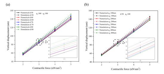 In order to further study the influence of perforation on the bending displacement of the perforated microcantilever, the effect of aperture and hole spacing on displacement was characterized, as shown in Figure 6. Here, the length of the microcantilever is 3000 μm, the width is 1000 μm, and the thickness is 100 μm, whereas the contraction force is 2~5 nN/μm2. The proposed numerical model and FEM model were used to characterize the effect of different apertures and spacing on the bending displacement of a perforated microcantilever. The aperture, d, increased from 50 to 80 μm, with intervals of 10 μm, whereas the volume fractions of porosity were found to be 0.053, 0.076, 0.104, and 0.136, respectively (q1: 300 μm; q2: 100 μm), as shown in Figure 6a. When the contractile force of the CMs is 5 nN/μm2 and the aperture is 80 μm, the bending displacements were calculated to be 151.1 μm and 146 μm from the numerical and simulation solution, respectively. Figure 6b shows the effect of hole spacing on the bending displacement of a perforated microcantilever with an aperture d of 50 μm and q2 of 100 μm. The spacing q1 increased from 100 to 400 μm, with intervals of 100 μm, and the volume fractions of porosity were 0.147, 0.076, 0.053, and 0.041, respectively. When the contractile force of the CMs is 5 nN/μm2 and the spacing q1 is 100 μm, the bending displacements are 151.1 μm and 146 μm based on the numerical and simulation results, respectively. The ratio of increase in aperture and decrease in spacing can directly increase the porosity factor of a perforated microcantilever. It is assumed that porosity is an important factor affecting the stiffness of a perforated microcantilever. When the porosity factor increases to 0.147, Young’s modulus increases; however, the maximum error between the numerical and simulation results becomes 3.4% (d: 50 μm; q1: 100 μm; q2: 100 μm; contractile force: 5 nN/μm2), as presented in Figure 6. Therefore, the numerical results agreed well with the simulation results, confirming that the numerical model can work well.