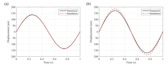The numerical and simulation results of the maximum displacements at the free end of the perforated microcantilever with a different Young’s modulus and substrate thickness: (a) the effect of Young’s modulus on a maximum displacement of the perforated microcantilever with different sizes (L * b * tf is 6000 μm * 2000 μm * 100 μm; d is 60 μm; q1 is 300 μm; and q2 is 100 μm) when the contractile force is 2 nN/μm2; (b) the effect of substrate thickness on the maximum displacement when the microcantilever length is 9000 μm and the contractile force is 2 nN/μm2.