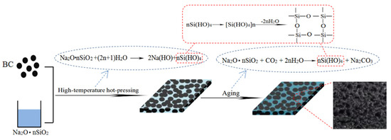 As shown in Figure 1, both BC and SS were uniformly mixed together and then pressed into BC/SS composites. SS acts as an adhesive and it was chosen because of its excellent advantages, such as waterproof, bacteria-proof, heat-resistant, acid-resistant, UV-resistant, and especially high-environmentally friendly performance [30]. In the hot-pressing and curing process, the main chemical reaction might be that Na2O·nSiO2 reacts with H2O and generates NaOH and Si(OH)4, which could be further dehydrated and condensed to produce a stabilized silicon three-dimensional structure affording strong adhesion [27]. During the aging process, the residual SS continued to react with CO2 and H2O in the air and to generate Na2CO3 and Si(OH)4, and the silicon three-dimensional structure was enhanced by the dehydration and condenses of Si(OH)4. When BC particles were in a certain size range, SS at the top of the composites solidified first and formed a relatively dense solidified layer. The water vapor in the inner of the composites did not have enough time to evaporate in the hot-pressing process, due to the internal resistance and bubble pores formed. In addition, the high viscosity of SS could make it difficult for the bubbles to escape [31]. In essence, SS, containing substantial quantities of moisture, also acts as a foaming agent under the condition of heating, so the porous BC/SS composites could be formed.