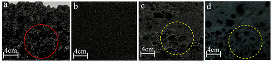 As shown in Figure 2, when the BC particle size was 1700 μm (mark “1700 μm-BC”), the distribution of SS in the composite was uneven at the mass ratio of 10:3~5 (BC/SS). The reason for this is that large-size BC particles would form large gaps among each other, which would allow SS to easily deposit to the bottom of the composite during the hot-pressing, leading to the lack of adhesives at the top of the composite and failure of formation (as shown in the red dotted line of Figure 2a) [32]. The composite with 270 μm-BC could be successfully prepared and shows uniform pore structure, which is because the smaller-size BC particles form smaller gaps and prevent SS from rapidly settling to its bottom during the hot-pressing, resulting in more uniform distribution (as shown in Figure 2b). At 149 μm- and 74 μm-BC, the composites show obvious bubbling and stratification (as shown in the yellow dotted line of Figure 2c,d), which might be a result of the gaps among BC particles being too small, making steam evaporation difficult during the hot-pressing. In a comprehensive consideration, the composite with 270 μm-BC is the optimal result and its properties and micro-structure would be studied in following.