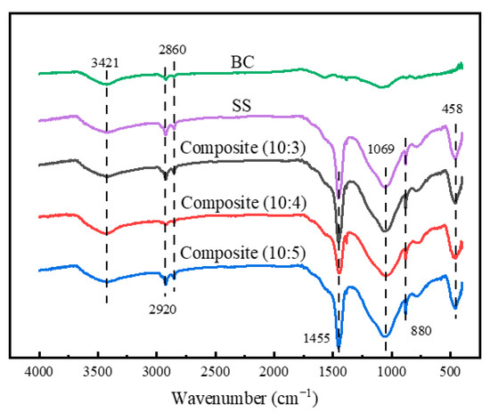 The chemical structure of the composites was analyzed by FTIR, and the result is shown in Figure 4. Compared with pure BC, both the SS and BC/SS composites show a stronger absorption peak at 3421cm−1 due to the bending vibration of –OH bond [33], proving that a certain amount of moisture from SS stays in the interior of the composites and SS in the interior is incompletely dehydrated and solidified. The absorption peaks at 1100 cm−1, 800 cm−1, and 458 cm−1 are caused by the antisymmetric stretching vibration, symmetric stretching vibration, and bending vibration of the Si–O–Si bond, respectively [34]. The absorption peak at 1455cm−1 comes from CO32− and the asymmetric stretching of C–H bond shows two absorption peaks at 2860 cm−1 and 2920 cm−1, indicating that there is HCO3− generating in the composites and corresponding to the speculation of the formation mechanism in Figure 1 [35,36], as well as illustrating that a part of SS is completely dehydrated and solidified in the hot-pressing and curing process. The solidification could improve the aging resistance and mechanical strength of the composites. Compared with pure BC and SS, the BC/SS composites have no new absorption peaks, proving that there is no chemical reaction between BC and SS, only physical bonding.