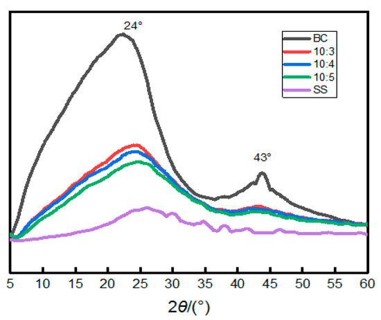 To test the change of their crystal degree, the composites were analyzed by XRD, with the pure BC as a contrast. As shown in Figure 5, the pure BC shows two diffraction peaks in the vicinity of 43° and 24°, respectively, which are caused by graphite crystallite crystal plane (002) and (001). The intensity of the diffraction peaks was reduced with the decrease in BC content, and the peak area gradually decreased. This is because the SS in the composites was not completely dehydrated and solidified, the solidification formed as a result of the water evaporation leads to the precipitation and full dehydration of the silica gel in the composite surface. The semi-solidified state of SS is conducive to improve the aging property and the mechanical strength of the composites.