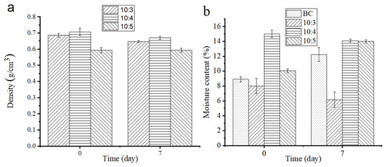 Normally, the densities of the BC/SS composites should increase with the increase in the SS proportion, due to a higher density of SS than BC, but it shows a different situation due to the influence of the foaming condition. As shown in Figure 6a, the densities of the composites first went up, and then down, with the increase in SS. This is because the foaming effect of the composites (10:3~4) was poor as a result of the low content of SS, and the density arose with the increase in SS. However, at the mass ratio of 10:5, the composite showed a good foaming effect, so the density decreased because a lot of water could escape through these foaming pores. At the mass ratio of 10:3~4, the densities of the composites were from 0.68 g/cm3 to 0.71 g/cm3, the minimum density appeared at (10:5) and was 0.59 g/cm3. After aging for seven days, the densities of the composites showed a similar change to that before aging, which depends on the content of SS and the foaming effect of the system. (10:5) exhibited no large change because the moisture evaporation reached equilibrium to the moisture absorption, and the densities of (10:3~4) decreased, which is caused by moisture evaporation in the composites during the cooling and aging process.