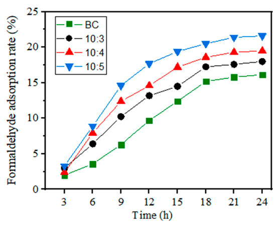 The formaldehyde adsorption capacity of the composites was estimated by a static adsorption test. As shown in Figure 8, the formaldehyde adsorption rate of the samples went up with time extension. The formaldehyde adsorption mainly occurred from 3 to 18 h, and gradually reached a saturation tendency after 18h, the formaldehyde adsorption rate of (10:5) was up to 21.6% at 24 h. Compared with the pure BC, the composites show a better adsorption ability for formaldehyde adsorption, and with the increase in SS, the static formaldehyde adsorption capacity gradually increased. This is because the increase in SS could improve the porosity of the composites and be good for formaldehyde adsorption.