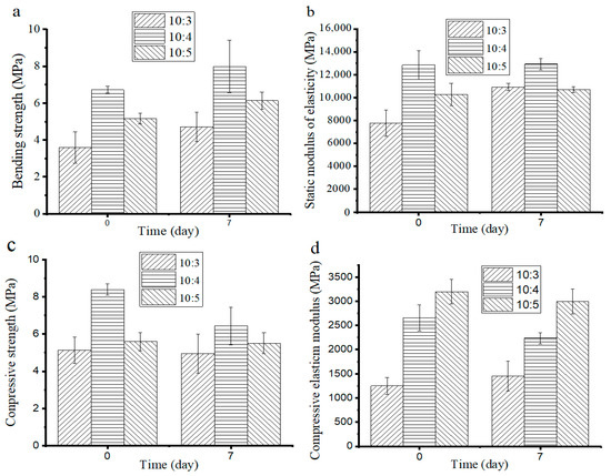 Before aging, the compressive strength of the composites had a similar change as the static bending strength (as shown in Figure 9c) and was 5.15 MPa, 8.4 MPa, and 5.59 MPa, respectively. After aging, the static bending strength of all the composites decreased to 4.94 MPa, 6.44 MPa, and 5.5 MPa, respectively. (10:4) appears significantly lower at the static bending strength, which might be associated with the decrease in its density (as shown in Figure 6a). The compressive elastic modulus of the composites had no obvious change after aging (as shown in Figure 9d). However, the compressive elastic modulus was less than the static modulus of elasticity, indicating that the composites exhibit greater brittleness. While a certain plastic deformation was generated in the compression process, the deformation ability decreased with the increase in SS content. Overall, the 270 μm-BC and the mass ratio of 10:5 (BC/SS) are the optimal conditions for the preparation of the composites.