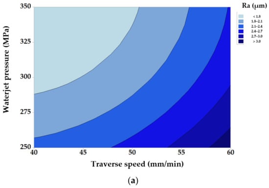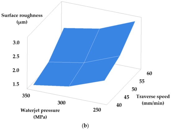 Roughness versus traverse speed and waterjet pressure set-point modification: (a) contour representation; (b) 3D response-surface.