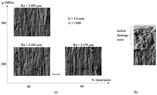 The microstructures of the cut surfaces were observed by scanning electron microscopy (SEM) for three sets of values of the traverse speed and the waterjet pressure (40 mm/min, 250 MPa; 40 mm/min, 350 MPa; and 60 mm/min, 250 MPa, respectively), as shown in Figure 4.