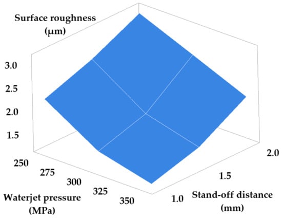 In this case, increasing traverse speed combined with increasing the stand-off distance causes a significant increase of roughness, thus damaging surface quality. This can be explained by the dependence of the kinetic energy of the abrasive jet in the cutting area on the stand-off distance—namely, a smaller stand-off distance maintains the coherence of the abrasive jet and consequently ensures its high kinetic energy at the impact on the surface. A high kinetic energy of the abrasive jet ensures a sufficient impact force such as to cut and remove the asperities of the machined surface. In addition, jet kinetic energy is higher for small stand-off distances, and consequently, penetration will be deeper and the kerf narrower.