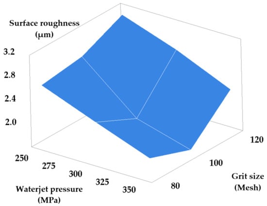 From Figure 3, it follows that decreasing water pressure simultaneously with increasing traverse speed has a negative influence on the quality of the machined surface (greater roughness). The obtained results can be explained as follows: a high pressure of the abrasive jet causes a higher jet speed, and implicitly, an increase of its kinetic energy. A high-kinetic-energy abrasive jet will remove material only by cutting and not by plastic deformation. This is favorable, as cutting leads to a better roughness, because it leaves finer traces on the machined surface, traces of smaller width and depth than plastic deformation.