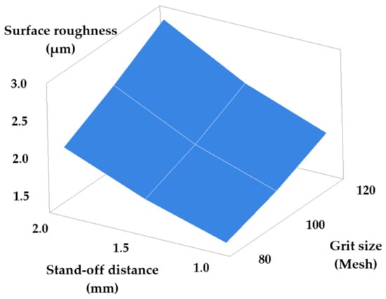 Figure 9 shows that a better roughness is obtained for fine graining (small grit size) and a small stand-off distance. On one hand, as discussed, a small stand-off distance ensures a high kinetic energy of the abrasive jet that is consequently capable of machining only by cutting. On the other hand, small grit sizes cause a dense pattern of small-depth traces on the machined surface. Both these aspects contribute to obtaining small roughness values, that is, a good surface quality.