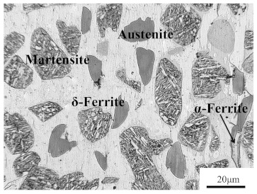 The chemical composition (% wt.) of the newly designed Fe–5Mn–3Al–0.1C high-strength lightweight steel is shown in Table 1. The experimental steel was prepared using vacuum induction melting, and was hot forged into a block. To obtain a homogeneous duplex structure consisting of austenite and δ-F, the block was homogenized at 1200 °C for 12 h, and then was furnace-cooled to room temperature. The microstructure of the experimental steel at room temperature consisted of δ-ferrite, austenite, and martensite, as shown in Figure 1, which suggests that martensite is formed through austenite–martensite phase transformation, however, δ-ferrite remains unchanged in the cooling process.