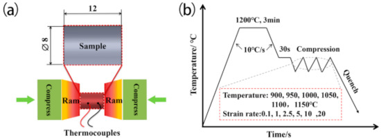 (a) Schematic plot of the hot deformation tests and (b) schematic plot of the hot deformation process tests.