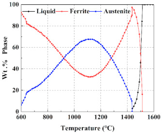 The phase transformation of the experimental steel was analyzed using JMatPro software, and then the equilibrium phase diagram was obtained, as shown in Figure 3. It can be clearly seen from Figure 3 that the ferrite, which is usually called high temperature δ-ferrite (δ-F), is formed in the liquid phase at about 1510 °C. When the temperature is lowered to 1439 °C, the liquid phase has completely transformed to δ-F. Then, the δ-F starts transforming to austenite at 1428 °C. The amount of austenite increases with the reduction of δ-F and reaches the maximum at 1103 °C. It is worth noting that δ-F does not completely transform to austenite, which can be ascribed to the fact that aluminum (Al) is a strong ferrite former and the addition of Al can stabilize the δ-F [3]. Subsequently, the austenite starts transforming to α-ferrite and then to martensite, until the temperature drops to 600 °C. From Figure 1, it is clear that the observed microstructure agrees quite well with the calculative one.