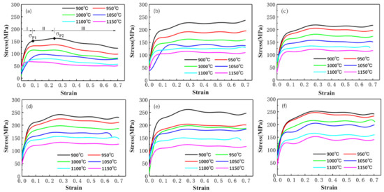 True stress–strain curves at various deformation parameters: (a) 0.1 s−1, (b) 1 s−1, (c) 2.5 s−1, (d) 5 s−1, (e) 10 s−1, and (f) 20 s−1.