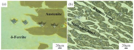 The micro-hardness was analyzed in order to illustrate the above phenomenon in detail. The Vickers hardness test results are shown in Figure 5. The micro-hardness of each phase is presented in Table 2. Figure 5a is the original structure of a forged Fe–5Mn–3Al–0.1C steel blank; the original structure consists of δ-ferrite and island-like austenite. Figure 5b is the microstructure of the sample deformed at the temperature of 950 °C and the strain rate of 0.1 s−1. The microstructure is composed of δ-ferrite and martensite transforming from austenite during the quenching process. The δ-ferrite and martensite are elongated via the compress process, and both of them display a banded microstructure. The micro-hardness of δ-ferrite increases from 143 to 246 HV. The micro-hardness of the initial austenite is 195 HV, which is comparable to the hardness of the austenite phase (212 ± 10 HV) in research conducted by Cai et al. [16]. It is reasonable to infer that the plastic deformation occurs first in the softer δ-ferrite phase, and then in the harder austenite phase. DRX occurs when the strain energy and interface energy accumulate to the critical values.