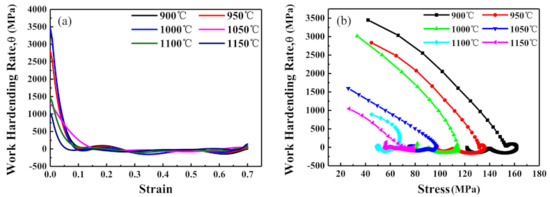 (a) θ−Strain and (b) θ−σ curves under different temperatures and a strain rate of 0.1 s−1.