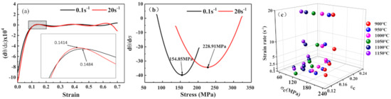 Variation of (a) d(θ)/d(σ)—strain, (b) d(θ)/d(σ)—stress at 900 °C, and (c) the plot of σc and εc under different conditions.