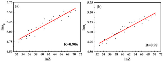 Figure 8 shows the plots of lnσp–1nZ and 1nσc–1nZ. As can be seen, the values of a2 and a4 are the slopes of the plots of 1nσp–1nZ and 1nσc–1nZ. The values of lna1 and lna3 are the intercepts of the two plots, respectively.