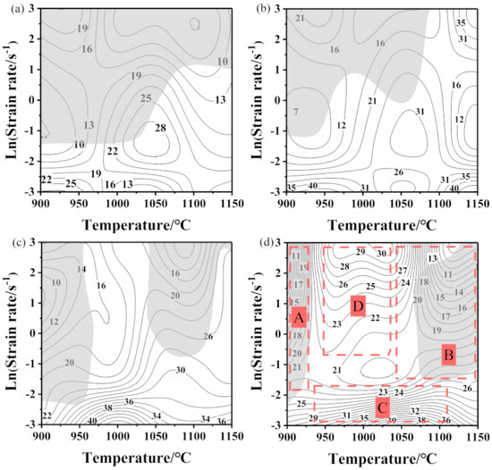 Processing maps under strains of (a) 0.1 s−1, (b) 0.3 s−1, (c) 0.5 s−1, and (d) 0.7 s−1.