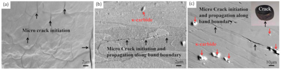 Region A is an instable area occurring in the temperature range of about 900 to 930 °C and the strain rate range of approximately 0.16 to 20 s−1. Tiny cracks present along the δ-ferrite grain boundaries, which can be clearly observed in Figure 11. As the strain rate increases, as observed in Figure 11a,b, the micro-cracks extend and longitudinal cracks are formed along the ferrite phase boundaries. The cracks extend to the surface when the strain rate reaches 20 s−1, which may lead to the fracture of specimens, as observed in Figure 11c. Note that the cracks are easily generated from the carbides located at the grain boundaries, which will lead to the occurrence of quasi-cleavage or cleavage fracture modes [34]. Research suggests that κ-carbides formed by Fe, Mn, C, and Al can be found in medium manganese automobile steel, which is not good for the stability of the microstructure [35,36].