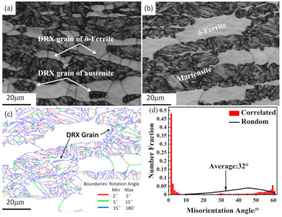 Region B is a flow instability area occurring in the temperature range of approximately 1075 to 1200 °C and the strain rate range of 0.22 to 20 s−1. Figure 12a and b show the EBSD band contrast maps of the samples deformed at the strain rate of 20 s−1 and the temperatures of 1000 and 1200 °C, respectively. DRX grains with a size of approximate 10 μm are formed in most of the observed areas, as shown in Figure 12a. By contrast, inhomogeneous DRX grains are observed in Figure 12b. This can be attributed to the fact that a higher temperature provides a higher driving force for the mobility of grain boundaries, which promotes the growth of DRX grains [20]. In order to determine whether the DRX of δ-ferrite has completed, the EBSD boundary map and misorientation distribution map of the specimen with inhomogeneous grains are plotted (Figure 12c,d). As can be clearly seen in Figure 12c,d, the low angle grain boundaries (lower than 5°) account for about 58.7%, and they distribute mainly in martensite due to incomplete dynamic recrystallization. However, the grain boundary angles of δ-ferrite are mainly larger than 5°, and such a mixed microstructure is usually considered a defect structure.