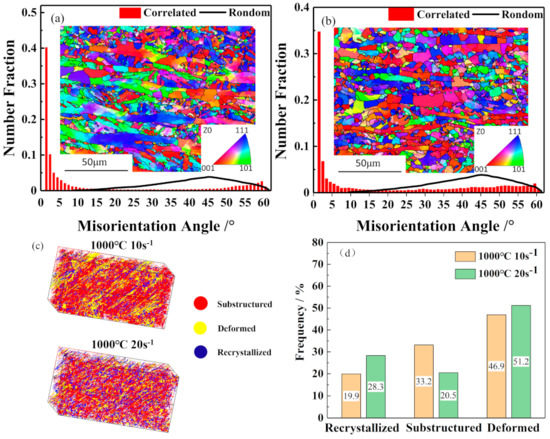EBSD band contrast maps under the conditions of (a) 1000 °C and 20 s−1, (b) 1200 °C and 20 s−1, (c) the grain–subgrain boundary map, and (d) misorientation distribution map of 1200 °C and 20 s−1.