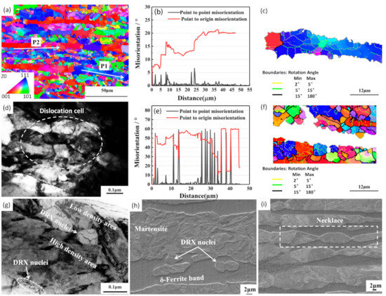 Figure 15g shows the TEM image of martensite. It can be observed in this figure that the small nuclei of DRX grains are formed at the bulging grain boundaries. The adjacent grains exhibit inhomogeneity of dislocation density, which is very important to the stability of grain boundaries during hot deformation. This internal difference will drive the grain boundaries to move from high-density areas to low-density ones, resulting in the bulge of the grain boundaries into low-density areas [38]. When meeting certain conditions, DRX grains will form and grow, as seen in Figure 15h. The grain boundary bulging can also lead to the formation of necklace morphology, as shown in Figure 15i. Therefore, the nucleation mechanism of martensite is grain boundary bulging [39,40].