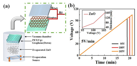 The fresh graphene/PET flexible substrate was transferred into the vacuum chamber for ultrathin ZnO layer evaporation at a pressure of 8 × 10−4 Pa at room temperature. Zinc oxide powder was placed onto a tungsten (W) boat, which was 160 mm below the substrate. Amorphous ZnO layers with different thicknesses of 40, 75, and 160 nm were thermally evaporated under different evaporation voltages (95, 100, and 105 V), i.e., the voltage applied on the tungsten boat as a heating source, and the rate of voltage increase was 5 V/min. A schematic diagram of the parallel resistance of amorphous ZnO/graphene composite film and the technological parameter graph of the deposition process are shown in Figure 1a,b [40]. The deposition rate of ZnO film increased nonlinearly with the evaporation voltage because the evaporation volume of ZnO powder depended on the temperature of the tungsten boat, which depended on the evaporation voltage—refer to the inset figure in Figure 1b.