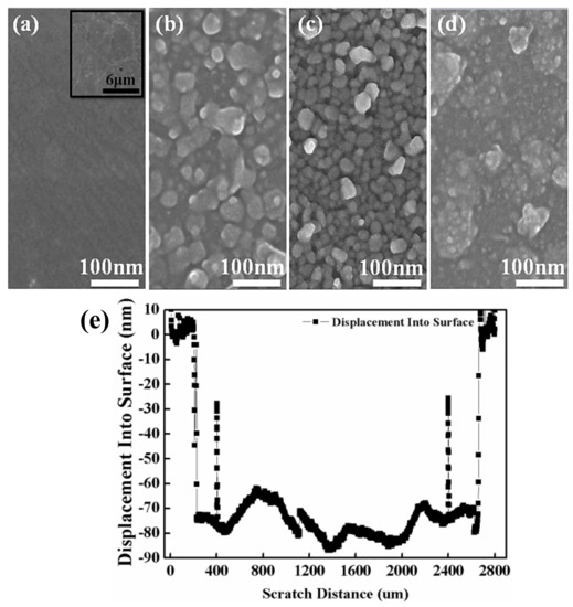 Top-view FESEM images: (a) bare graphene/PET and different ZnO films with thickness of (b) 40 nm, (c) 75 nm, and (d) 160 nm which were evaporated onto a graphene/PET substrate at different voltages of 95, 100, and 105 V; (e) profilometer scan of ZnO film with 75 nm thickness.