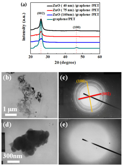(a) X-ray diffraction spectra of graphene/PET and ZnO (40, 75, and 160 nm thickness)/graphene/PET; (b,c) TEM image and SAED pattern of graphene/PET; (d,e) TEM image and SAED pattern of ZnO/graphene/PET.