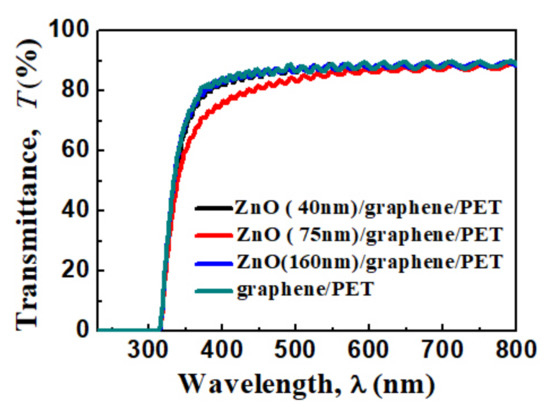 The transparent spectra of the graphene/PET and amorphous ZnO/graphene/PET are displayed in Figure 5. The average transparency of the ZnO/graphene/PET composite film was 90% at the 600 nm wavelength range. The slightly lower transparency of the composite film with a 75 nm ZnO layer within the 300–600 nm wavelength might be due to the granular structure (Figure 3c), which resulted in light scattering and absorption functions of the film [46].
