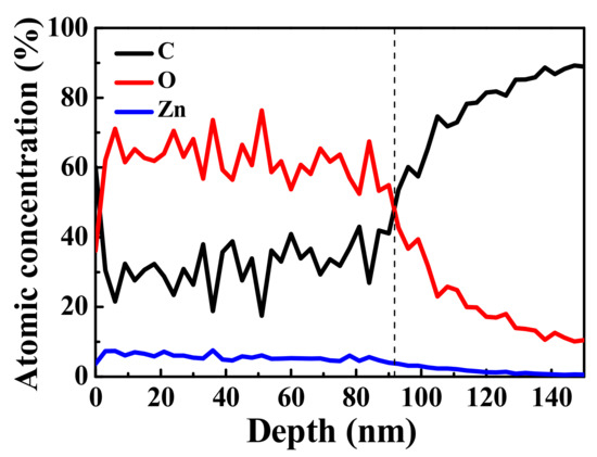 The distributions of C, O, and Zn elements at different depths of the ZnO/graphene/PET composite film are shown in Figure 6. The proportions of C, Zn, and O remained stable up to a depth of about 90 nm. The different thicknesses of the ZnO layer were due to errors in the two measurement techniques. With further sputtering on the composite film up to a depth of 140 nm, only C from the graphene remained. XPS studies on graphene revealed that 1 kV Ar+ ion bombardment did not damage the graphene hexahedral structure [49,50,51]; therefore, with the increase in sputtering time, presented as “depth” in Figure 6, O and Zn from ZnO were sputtered away and C from graphene remained. The information of O and Zn at the amorphous ZnO/graphene interface became weak, and that of C was stronger. Thus, it can be concluded that the graphene remained between the amorphous ZnO layer and PET substrate, which was not affected by the evaporation procedure. In other word, the graphene should contribute its conductivity to the composite films.