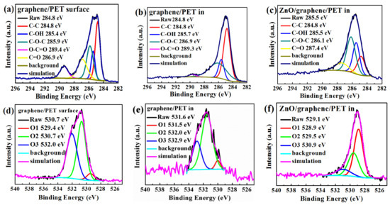 The binding energies of O1 at 530.0–531.6 eV overlapped and were identified as C=O and C-O bonds; the binding energies of O2 and O3 at 532.4–533.3 eV were identified as C-OH [49]. The two O1s positions in the XPS spectra of the graphene surface (Figure 7d) and the graphene/PET interface (Figure 7e) were similar, but the O1 peak at the interface of the amorphous ZnO/graphene/PET (Figure 7f) sharply erupted. This indicates that C=O and C-O bonds were formed at the interface of the amorphous ZnO/graphene again. This evidence further proves that C from graphene combined with O from the amorphous ZnO layer.