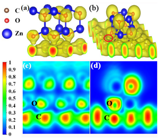 The electron localization functions (ELFs) were calculated to further investigate the bonding natures at the crystal (Figure 8a) and amorphous (Figure 8b) ZnO/graphene interfaces. It can be seen from Figure 8a,b that the electron clouds are localized around O atoms (yellow color) and delocalized from Zn atoms, whether in the crystal ZnO model A or the amorphous ZnO model B, which indicates the ionic bonds of ZnO. Also, the covalent C-C bond in graphene can be found in Figure 8, in which the electron localization density of graphene is shown to be fair. The clear distinctions between the two models are as follows: The localized electron clouds C and O are separated between crystal ZnO and graphene, and there is no bond formed between the O of crystalline ZnO and the C of graphene (Figure 8a,c). The localized electron cloud of O from amorphous ZnO joins together with that of C from graphene, which indicates the formation of covalent bonds between the O of amorphous ZnO and the C of graphene (Figure 8b,d). In other words, the crystalline ZnO and graphene do not form chemical bonds, while C-O covalent bonds are formed between the amorphous ZnO and graphene.