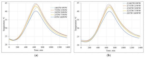 The hydration temperature of hardened cement pastes: (a) with concrete wash water; (b) with the combination of concrete wash water and zeolitic by-product.