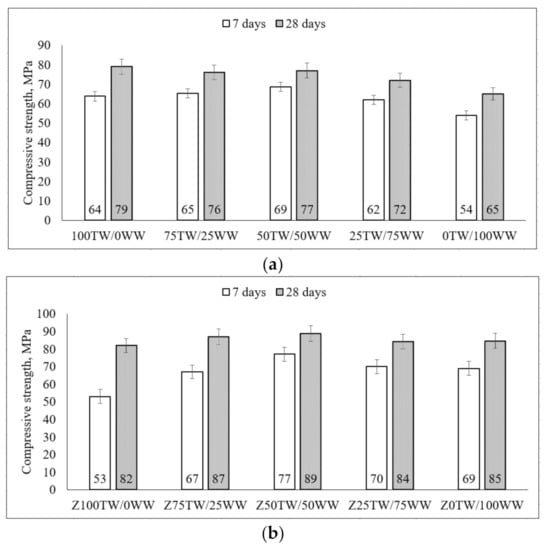 The compressive strength of hardened cement pastes with concrete wash water (a) and with the combination of concrete wash water and zeolitic by-product (b) at 7 days and 28 days.