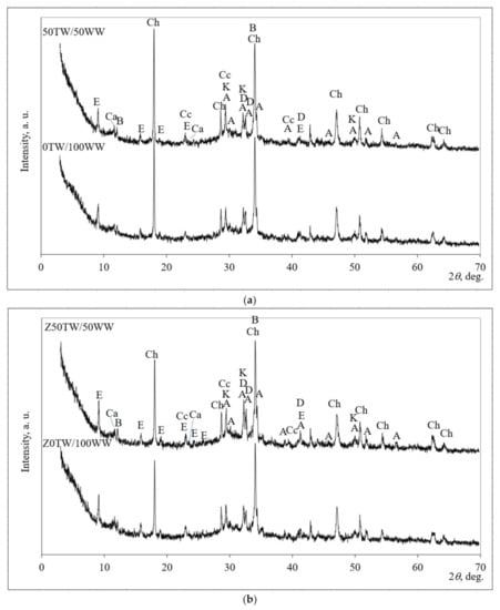 The mineral composition was determined by using XRD patterns (Figure 5). The mineral compositions of four samples (0TW/100WW, 50TW/50WW, Z0TW/100WW and Z50TW/50WW) were analyzed. These samples were chosen due to the highest compressive strength of the above-mentioned compositions (Figure 4).