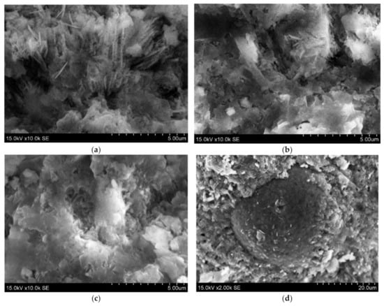 The analysis of scanning electron microscopy (SEM) was performed for the evaluation of microstructure (Figure 7). It was detected a relatively porous matrix of Z50TW/50WW sample (Figure 7a,b). Chatveera et al. [4] stated that the incorporation of concrete wash water in the cement systems led to the formation of a more porous and weaker matrix compared to the matrix of samples with tap water. The mixture of concrete wash water and zeolitic by-product (Z50TW/50WW) had an influence on the microstructure of the hardened cement paste. It became denser compared with the microstructure of the samples with concrete wash water (Figure 7c). This change of microstructure could be related to complex chemical reactions of OPC, zeolitic by-product and the fines present in the concrete wash water [3,45]. The round particle of zeolitic by-product is coated with hydration products due to the pozzolanic effect is detected in (Figure 7d).