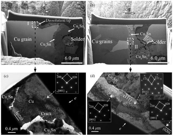 The increasing demand for miniaturized, multifunctional portable electronic products and devices has led to a continuous scaling-down of the dimensions of solder joints in microelectronic packaging. Such downscaling dramatically increases the current density in the solder joints, causing electromigration (EM), that is, the directional migration of atoms under a high-density electric current [1,2,3,4]. EM can significantly deteriorate the performance of the solder joints, such as the polarity growth of the interfacial intermetallic compound (IMC), the ductile-to-brittle transition of the solder matrix, the hillocks or whiskers, the cathodic crack, and even the direct opening failure [5,6,7,8,9,10], etc.; therefore, it has become a serious reliability concern in microelectronic devices and products. Additionally, the high current density also brings the Joule effect and thermomigration (TM), which can significantly enhance the local temperature of solder joints and even lead to the liquid–solid migration [11,12]. Meanwhile, thermomechanical stress can be induced by the couple of EM and TM [13]. Hence, EM-induced failure has been widely researched. The failure mechanisms of solder joints induced by EM are extensively studied and many results have been obtained [14,15,16,17], and one of the most well-known results is that when the c-axis of β-Sn grains, which usually refers to the Sn grain orientation, is aligned or nearly aligned along the current direction, the Cu atoms diffuse quickly and the EM deterioration is more serious [18,19].