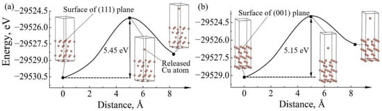 After release from the crystallographic plane, the atoms must overcome the energy barrier of this plane to diffuse under current stressing. The higher the energy barrier, the more difficult the atoms releasing nearby this plane. Therefore, the energy barriers of releasing Cu atoms from the (111) and (001) planes toward phase boundaries, which can be simplified as vacuum layers, were also calculated. Figure 4 plots the total energy versus the distance between the released Cu atom and the crystal surface. The energy barriers of releasing Cu atoms from the surfaces of the (111) and (001) planes were 5.45 and 5.15 eV, respectively. Obviously, owing to the lower energy barrier, Cu atoms in the (001) plane are easier to diffuse compared to the (111) plane.