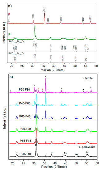 X-ray diffraction patterns of the (a) PZT-type material (P) and Ni0.5Zn0.5Fe2O4 materials (F), (b) P-F ceramic composites.