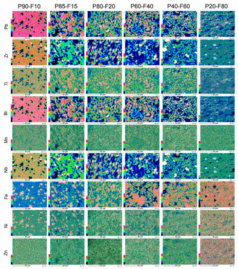 The EPMA maps of the individual elements distribution of the P-F ceramic composites are depicted in Figure 3. EPMA analysis uses the X-ray emissions induced by an electron beam and was made on the surface of the samples. The analysis showed the distribution of individual elements in composite samples arranged according to the components of the composite phases, i.e., the ferroelectric and the magnetic phase. The EPMA analysis is consistent with the results of the EDS tests. In the areas of composite samples where these phases occur, the increased intensity of their individual components is visible. The most homogeneous distribution of the constituent elements is shown for the P90-F10 composite sample.