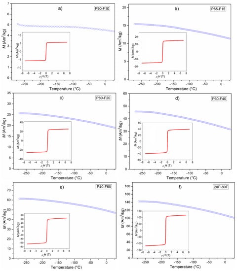 Temperature dependencies of magnetization for ceramic P-F composites: P90-F10 (a), P85-F15 (b), P80-F20 (c), P60-F40 (d), P40-F60 (e), and P20-F80 (f) (inset—magnetic hysteresis loops at RT).